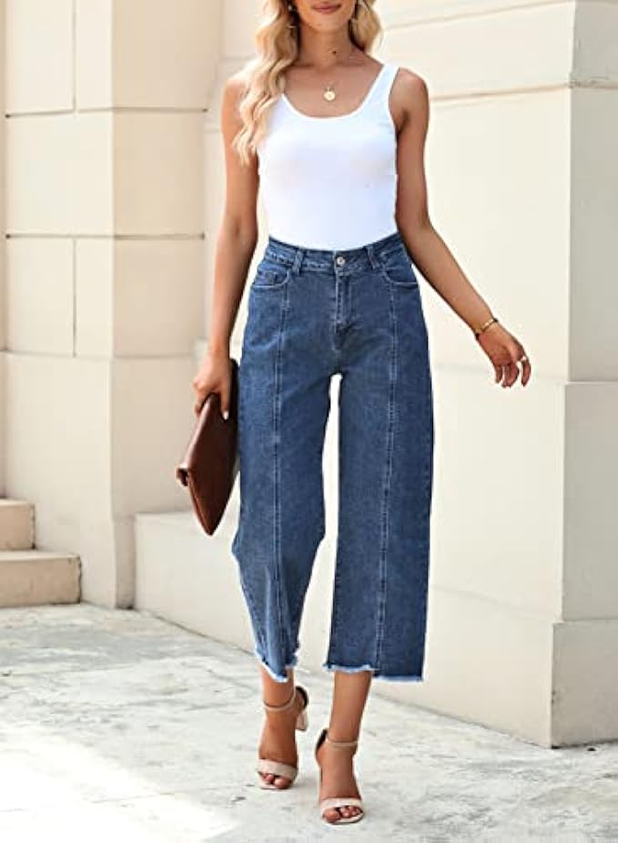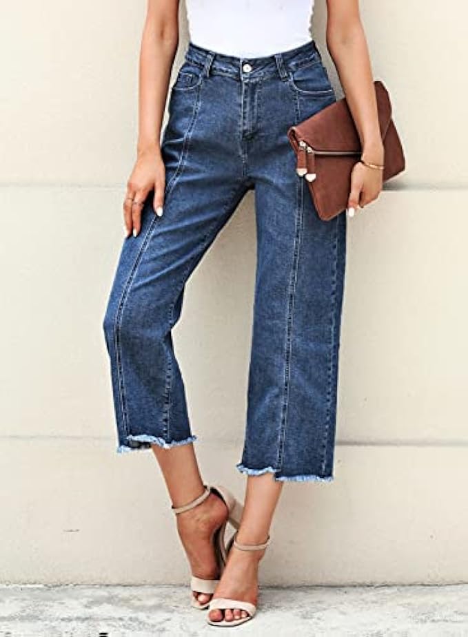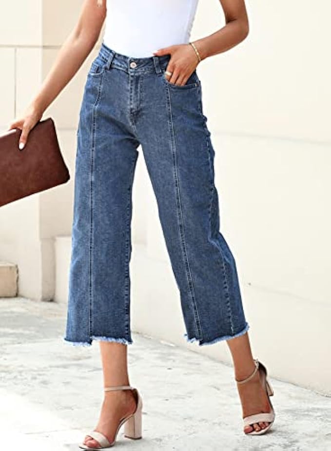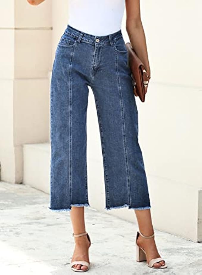 <li class="a-spacing-mini"><span class="a-list-item"> 70%Cotton, 28.5%Polyester, 1.5%Elastane </span></li> <li class="a-spacing-mini"><span class="a-list-item"> Imported </span></li> <li class="a-spacing-mini"><span class="a-list-item"> Zipper closure </span></li> <li class="a-spacing-mini"><span class="a-list-item"> Machine Wash </span></li> <li class="a-spacing-mini"><span class="a-list-item"> The jeans designed with a wide leg opening that provides a comfortable and breathable fit, the raw hem finish gives the jeans a trendy and edgy look, making them a popular choice among fashion-conscious individuals. </span></li> <li class="a-spacing-mini"><span class="a-list-item"> The wide leg design also allows for easy movement, making them ideal for a range of activities.Loose fit jeans featured pinched seams at front, which sits comfortably on the hips and provides a flattering silhouette. </span></li> <li class="a-spacing-mini"><span class="a-list-item"> These jeans are crafted from premium denim and feature a wide leg cut that is both comfortable and flattering. The raw hem adds a touch of edginess to the design, making these jeans perfect for any fashion-forward woman. </span></li><li class="a-spacing-mini"><span class="a-list-item">Wide leg capri jeans are versatile and easy to style, pairing well with a simple t-shirt and sneakers, or a blouse or a fitted top and heels, making them a must-have item in any wardrobe.</span></li> <li class="a-spacing-mini"><span class="a-list-item">Straight wide leg jeans are versatile and can be worn in a variety of settings. Such as office casual, club or holiday. Well, they can be dressed up or down and worn in a variety of settings, making them a go-to choice for any occasion.</span></li>