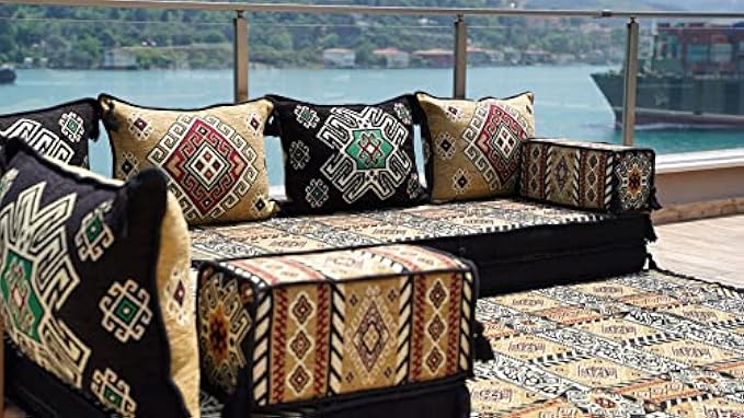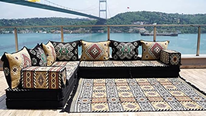 4" Thick L Shaped Floor Couch, Arabic Sofa Seating, Floor Pillow, Sectional Sofa Set, Patio Furniture, Arabic Majlis (L Sofa + Rug, 8'' Thickness (20 cm))