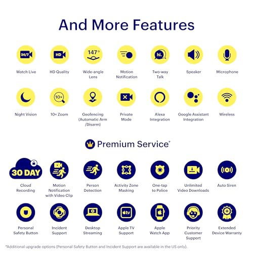 ADDITIONAL FEATURES: 30-day video cloud history, smarter motion alerts with video clips & person detection, activity zone masking, auto siren, safety button, extended warranty & more with Premium Service plan