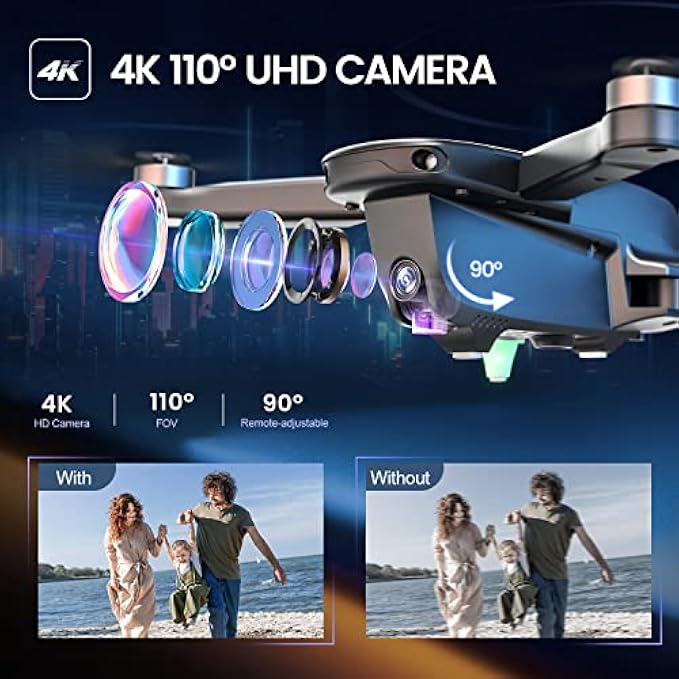 4K Ultra Clear Camera: 4K camera with 110° wide-angle and 90° adjustable provides a high resolution picture, enable to capture a perfect shot; 5GHz FPV transmission delivery a smooth and stable videos even in high-speed or strong-wind conditions