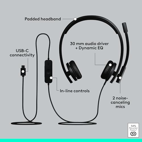 About this item Certified for Microsoft Teams: This USB headset features 2 noise-canceling microphones and a 30mm audio driver to ensure you can hear and be heard clearly in noisy open workspaces Effortless Controls for Better Productivity: The easy-to-use inline controls on this wired headset provide convenient access to volume, mute, call and Microsoft Teams features Call and Mute Status Indicators: LED lights on the computer headset controller provide a convenient visual cue for call and mute status USB Plug-and-Play: Connect to a PC or Mac via USB-C cable with no additional software required; reliable wired connection ensures uninterrupted use, eliminating concerns about low batteries Designed for Sustainability: This office headset with mic is made with a minimum of 54% post-consumer recycled plastic (1) in the plastic parts, plus replaceable earpads to extend product life Lightweight Comfort: The headset weighs a mere 113 grams and features leatherette ear pads, a padded headband, and a featherweight design for a comfortable fit that won’t weigh you down Remote Management: Logitech Sync offers IT admins a secure and scalable approach to remotely manage and update each work headset; requires Logi Tune (2) downloaded on individual laptops Customize the Experience: Customize audio settings with Logi Tune (2); adjust sidetone and mic level, enable anti-startle protection, and more
