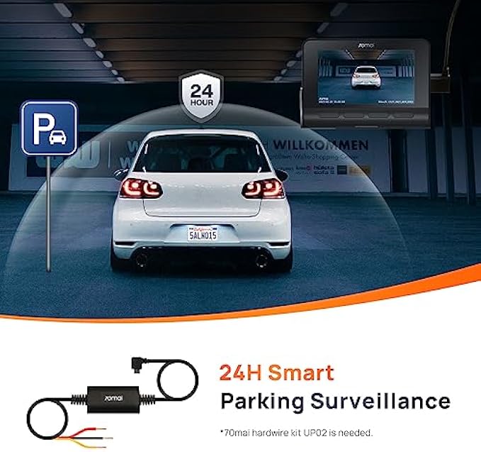 • 【24-Hour Parking Surveillance】Keep monitoring when you leave your car, the G-sensor automatically detects sudden shakes or collisions and starts recording, providing critical evidence for every important moment for 24h. In the event of an accident, you'll receive a notification to check the event footage in the 70mai app. 70mai Hardwire Kit UP02 (B08R5SBKZR, not included) is required for parking mode