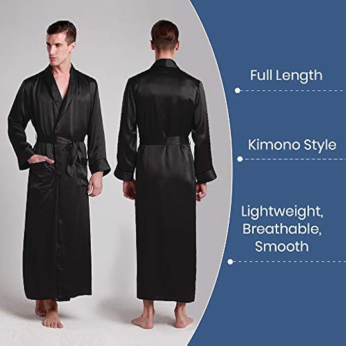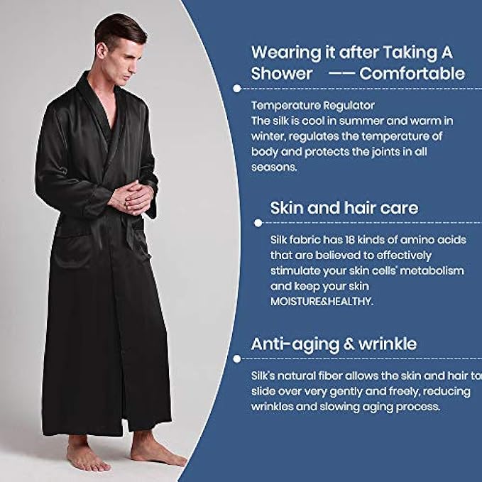 <li class="a-spacing-mini"><span class="a-list-item"> ★FRENCH SEAM + HIGH END MATERIAL: Top craftsmanship & luxurious silk charmeuse in rich color. A dapper take on our most popular lounge and sleep set, silk is light & amazingly space save for travel </span></li> <li class="a-spacing-mini"><span class="a-list-item"> Tie closure </span></li> <li class="a-spacing-mini"><span class="a-list-item"> Machine Wash </span></li> <li class="a-spacing-mini"><span class="a-list-item"> NATURAL MULBERRY RAW SILK: This mens long sleeve silk robe is woven from 100% mulberry silk, real silk, luxury and really worthwhile for the price. Rich color just as picture shows. The silk bath robe is made of high quality real silk material which feels super soft and contains 18 kinds of amino acid and it is the protein fiber, lightweight & wrinkle-Resistant, comfortable, healthy, comfy, soft and smooth like baby skin). </span></li> <li class="a-spacing-mini"><span class="a-list-item"> FULL LENGTH, KIMONO DESIGN, INNER TIE: Pamper yourself and relax in this soft, Japanese kimono style silk bath robe. Featured long sleeve with band cuff, two handy pockets, silk tie closure with belt loops and French seam finish, extra long robe for lounging. Different from satin ones, silk robe can let your skin breathe freely, slow down the skin aging process. Workmanship ensures the quality and all details to be best. Beautiful gift idea on Valentine’s Day, Wedding, Birthday or Christmas Day </span></li> <li class="a-spacing-mini"><span class="a-list-item"> ROOMY, SOFT, COMFY, TEMPERATURE REGULATOR, LUXURY, WELL DRAPE : This silk robe is heaven on earth. Classical, luxurious, incredibly soft and sensual. We use 6A Grade silk (22mm) so it looks richer, fits suitably, and feels even more indulgent. Woven exclusively from 6A grade, 100% real mulberry silk. It weighs more than most lingerie silk, for richer luster, gorgeous drape and feel - yet is light enough to be breathable and flow delicately, the way a silk garment should. </span></li> <li class="a-spacing-mini"><span class="a-list-item"> HIGH END LEVEL FOR WHO ENJOYS LIFE (Soft, Comfy, Affordable, Luxury )silk kimono robes? If you are a delicate person and you want something better to offer you an enjoyable feeling for sleeping and lounging, a healthy sleeping condition and a royalty experience. Yes, this soft mulberry silk robe is designed for you. </span></li> <li class="a-spacing-mini"><span class="a-list-item"> More Reasons for Why LILYSILK: Certified by Oeko-Tex standard 100; Beautiful and durable gift box packed; Free express shipping offered; 24 Hour customer service online; Easy Care with Hand or Machine Wash in Cold Water on Gentle Cycle; Easy return with 30 days policy; It is easy to care and with good care it will last for years! Repeat customer aperiodically gets mystery gift! </span></li>