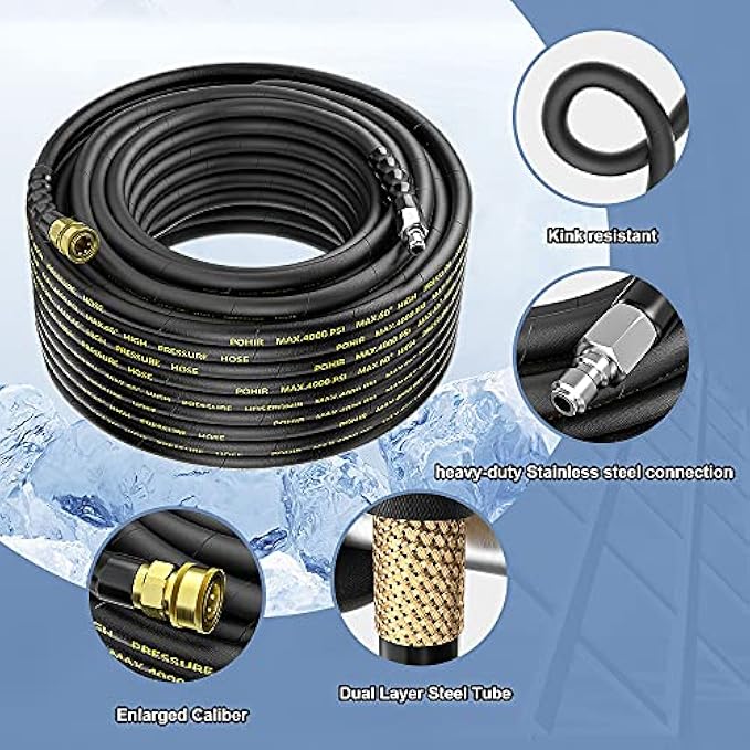 • ♛【Pressure Washer Hose 4200 psi】MAX working pressure of this high pressure washer hose can reach 4200 PSI. The burst pressure is up to 16000 PSI. Max working temperature is 140℉ / 60℃. Flow rate is 2.5 GPM to 5 GPM. It's designed to be compatible with most brands of gas or electric pressure washers, and garden hose reel or hose holder.