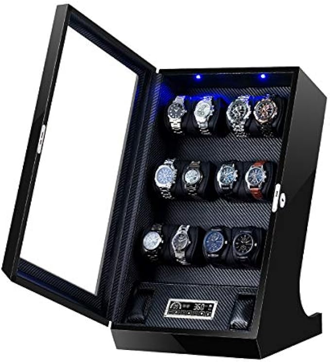 • ⌚SILENT MOTOR INSIDE LUXURY WATCHES WINDING DISPLAY CASE FOR 12 AUTOMATIC WATCHES: Japanese mabuchi motor was built inside watch winder storage box, is extremely quiet and long lasting, running with no noise; Japanese mabuchi motor can effectively reduce noise as low as 5-8 db, run quietly and safe, having no effect on your daily life.