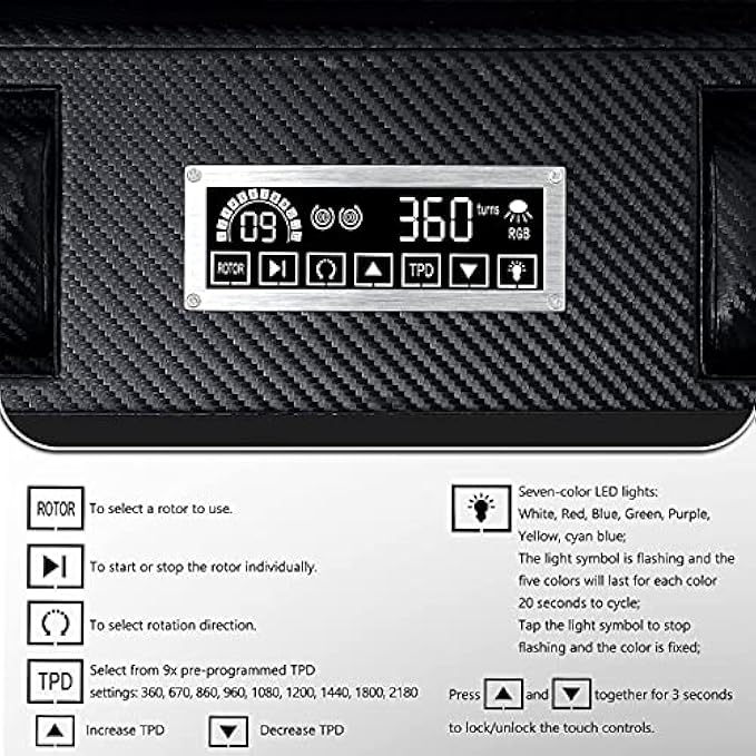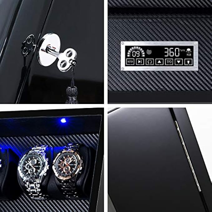 • ⌚MULTIPLE ROTATION MODES OF SPINNING WATCHES STORAGE BOX: LCD Touch control board & Three rotation direction: Clockwise(CW) only, Counter-clockwise(CCW) only, Clockwise+Counter-clockwise(CW+CCW). TPD:(range:16-5760 TPD) Select from 9x pre-programmed TPD (turns per day) settings: 360, 670, 860, 960, 1080, 1200, 1440, 1800, 2180; Each TPD has same rotation speed but different interval time. Built-in 7 colors LED light. You can select the color you like to before winding your luxury watches.