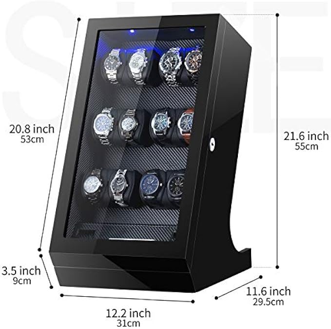 • ⌚LARGE CAPACITY OF 12 AUTOMATIC WATCHES WINDER + 2 WATCH SHOWCASES STORAGE BOX FOR LUXURY WATCHES: 12 independent watch shaker boxes + 2 storage watch spaces inside our piano shell wooden watch winder box with elastic cotton pillow. You can storage and display 12 automatic watches like rolex, omega, longines and other luxury watches. This rotating watch shaker box can be winding your watches and storage your watch in the same time.