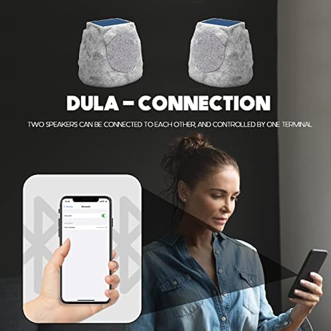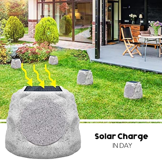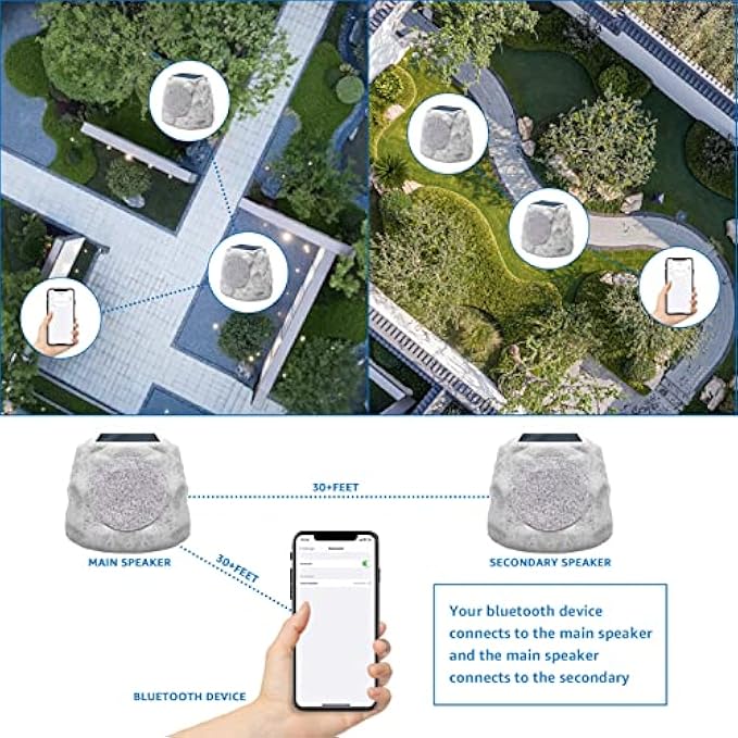 • ☀【IP44 Waterproof + Outdoor speakers】This outdoor bluetooth speakers features a standard IP44 Waterproof design. The rock solid exterior of the speaker can withstand all weather conditions. You can put them in the rain, snow or harsh sunlight, and it will work fine. At the same time outdoor Speaker's faux rock design can blend perfectly with your garden, patio or backyard while providing you with beautiful, lively music!
