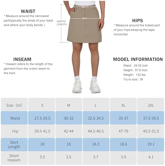 • ZIPPER BUTTON CLOSURE: Women 18" skorts, highlight the leg line proportions. Zip front flies with snap closure and an elastic waistband, easy to put on and take off, and provides a perfect fit for your body