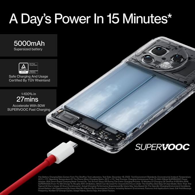 • Charge Ahead: The OnePlus 11 5G comes with a 80W SUPERVOOC charger straight out of the box. Improved battery health & active cooling will ensure your OnePlus 11 will have improved battery longevity.Charge Ahead: The OnePlus 11 5G comes with a 80W SUPERVOOC charger straight out of the box. Improved battery health & active cooling will ensure your OnePlus 11 will have improved battery longevity.
