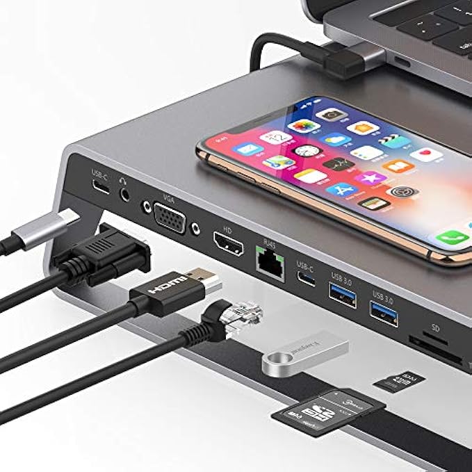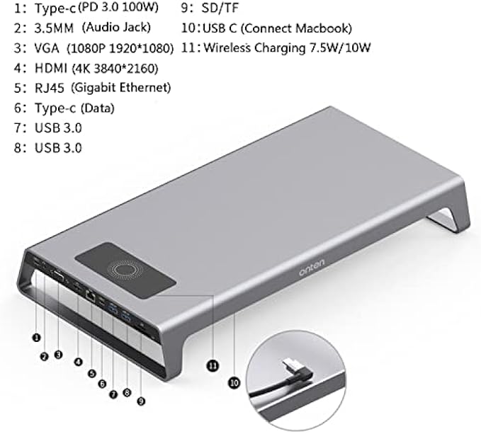 • .multiple interfaces 2*USB3.0 ,1*PD3.0 100W,1*USB C Data,TF/SD Card Reader,4K HDMI*1,VGA*1 ,Gigabit Ethernet,7.5W/10W Wireless Charging .