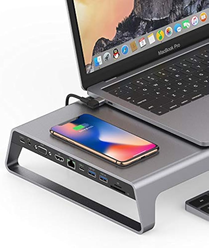 USB C Docking Station,Laptop Aluminium Item Stand with Wireless Charging 2*USB3.0, Gigabit Ethernet Power Delivery 100W, TF/SD Card Reader Compatible with MacBook Pro/Air and More
