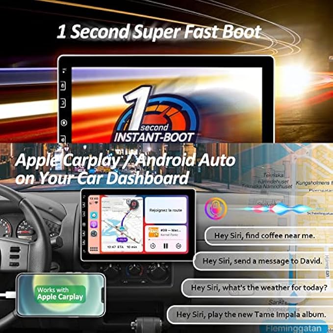 • ✔Compatible with CarPlay and Android Auto, Turn Your Dashboard into a Mobile Command Center - Your dashboard just got smarter. 1 second super fast boot. Compatible with Apple CarPlay and Android Auto, this touch screen car stereo lets you conveniently access apps from iPhone and Android phone.
