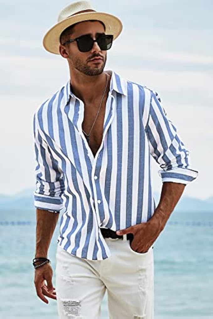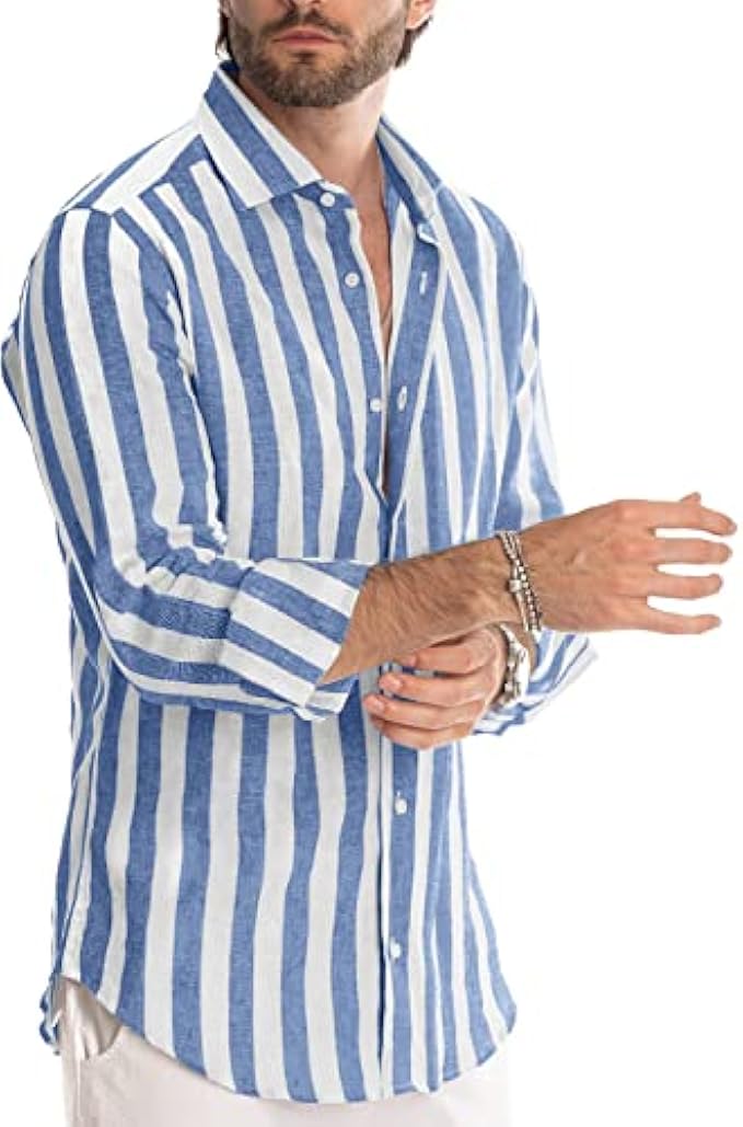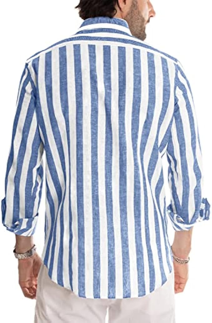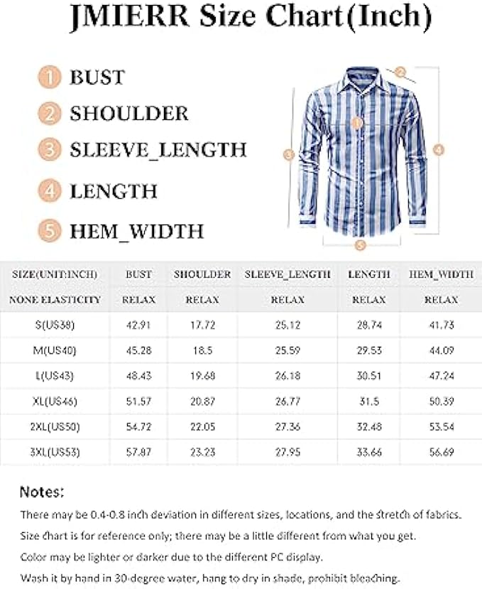 <li class="a-spacing-mini"><span class="a-list-item"> 65%Polyester+35%Cotton(It has the look and feel of a linen,Soft and Breathable) </span></li> <li class="a-spacing-mini"><span class="a-list-item"> We Use American Standard Size: S=(US 38), M=(US 40), L=(US 43), XL=(US 46), 2XL=(US 50), 3XL=(US 52) </span></li> <li class="a-spacing-mini"><span class="a-list-item"> Button closure </span></li> <li class="a-spacing-mini"><span class="a-list-item"> Machine Wash </span></li> <li class="a-spacing-mini"><span class="a-list-item"> Material: Our JMIERR Fashion Men's 2023 Button Down Long Sleeve Shirts are crafted with high-quality cotton fabric, offering the look and feel of linen. The fabric is soft, breathable, lightweight, and skin-friendly, making it perfect for both casual and dress occasions. </span></li> <li class="a-spacing-mini"><span class="a-list-item"> Features: These cotton long sleeve dress shirts for men feature a striped color and button-down design, creating a casual yet professional look. The classic design and slim fit make you look clean and fashionable, while the pure cotton fabric adds texture. You can choose to wear the sleeves as 3/4 sleeves or full sleeves for added versatility. </span></li> <li class="a-spacing-mini"><span class="a-list-item"> Pairing Options: Our men's long sleeve button-down shirts are a perfect match with solid t-shirts, jeans, shorts, or even a suit sportcoat blazer. They are an essential item in any man's wardrobe, offering endless styling possibilities. </span></li><li class="a-spacing-mini"><span class="a-list-item">Multiple Occasions: These casual and stylish men's shirts are suitable for all occasions, especially casual outings, beach trips, cruises, resorts, and vacation activities. They are perfect for spring, summer, and autumn, and can be worn for fashion street style, dates, Hawaiian parties, everyday casual wear, beach wear, and more. They also make perfect gifts for your boyfriend, son, husband, or even yourself.</span></li> <li class="a-spacing-mini"><span class="a-list-item">Package Content & Service: Each order includes 1 men's shirt from JMIERR. Before ordering, please refer to the JMIERR Size Chart for accurate sizing. We value customer satisfaction and are dedicated to providing exceptional service.</span></li>