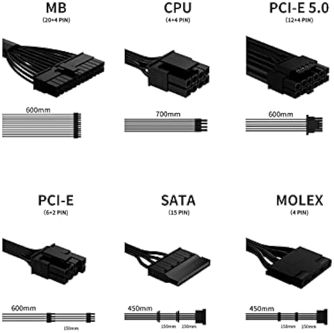【Multi-Choice Cable】 Offers cable selection for users: 1*MB (20+4 PIN) | 2*PCI-E (6+2 PIN) | 3*SATA (15 PIN) | 2*CPU (4+4 PIN) | 1*MOLEX (4 PIN) | 1*PCI-E 5.0 (12VHPWR supply power up to 600W TDP to the most advanced graphics cards such as RTX 4080/4090). Low-profile flat black cable are extremely flexible and thin, makes management easier.