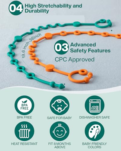 Easy to Clean and Sterilize: Made of food-grade, heat-resistant silicone, our stroller toy straps are easy to wash in water or put in a dishwasher or sterilizer for cleaning. The set comes with 5 toy holder straps in gray, orange, dark red, green, and tiffany blue. The design helps promote baby visual, motor, and sensory development.