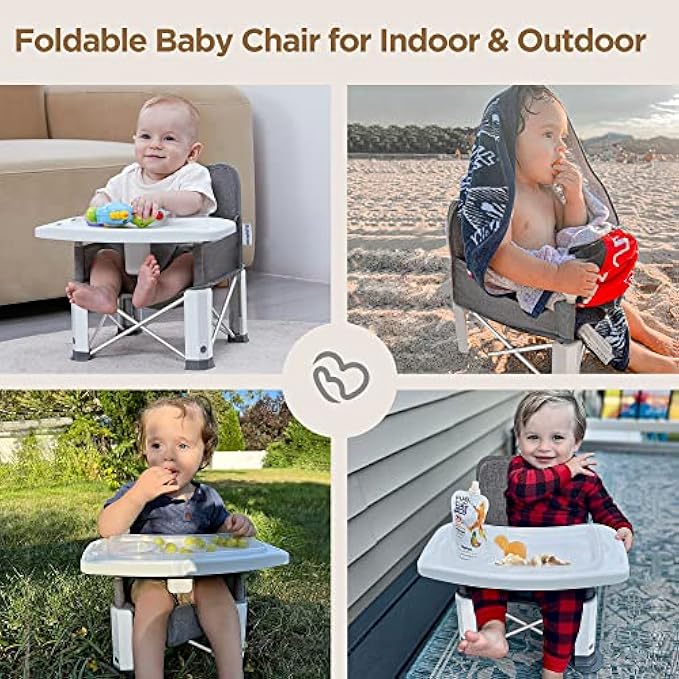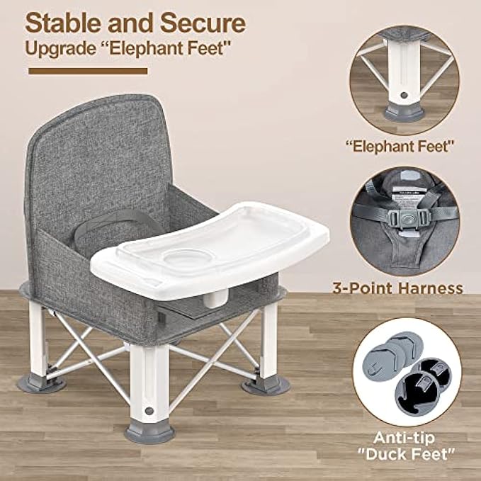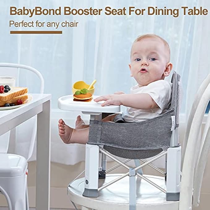 Baby Travel Booster Seat with Double Tray, BabyBond Upgraded Toddler Portable Baby Chair, Booster Seat for Dining Table, Stable and Foldable Booster Baby Chair for Indoor/Outdoor (Grey)