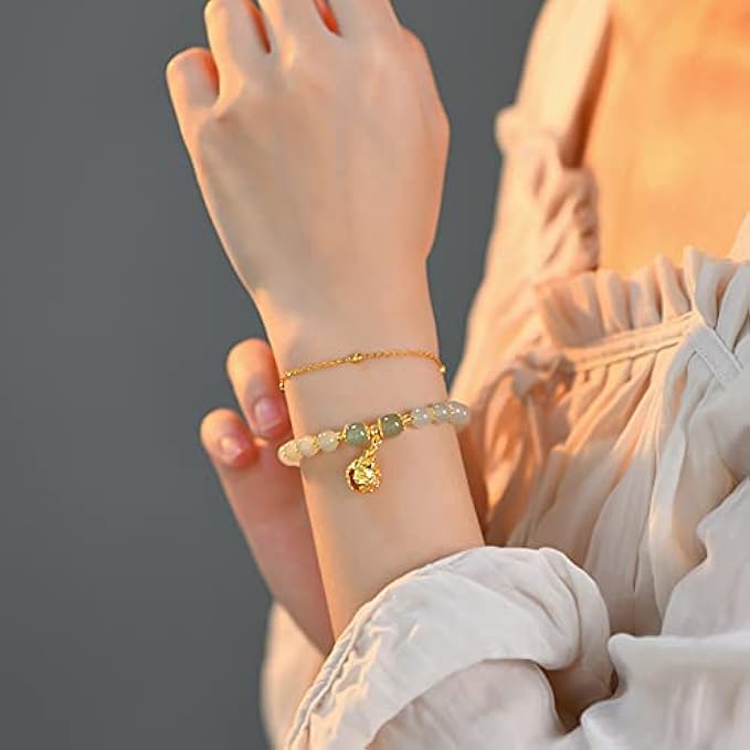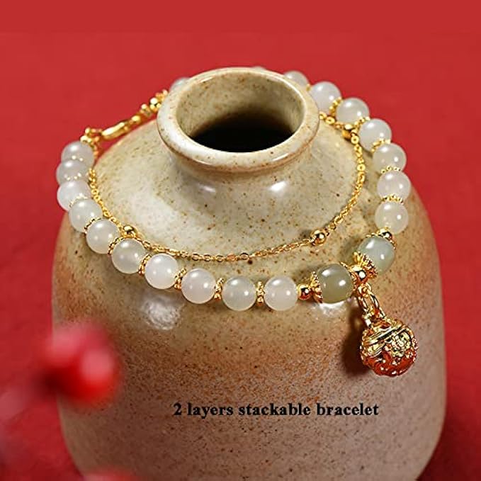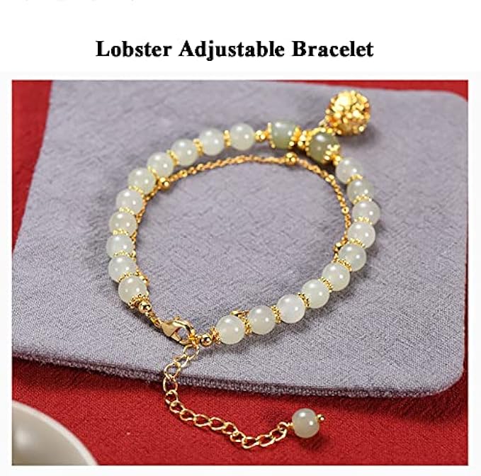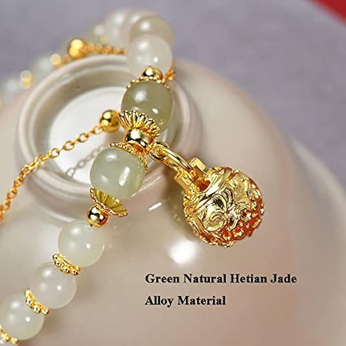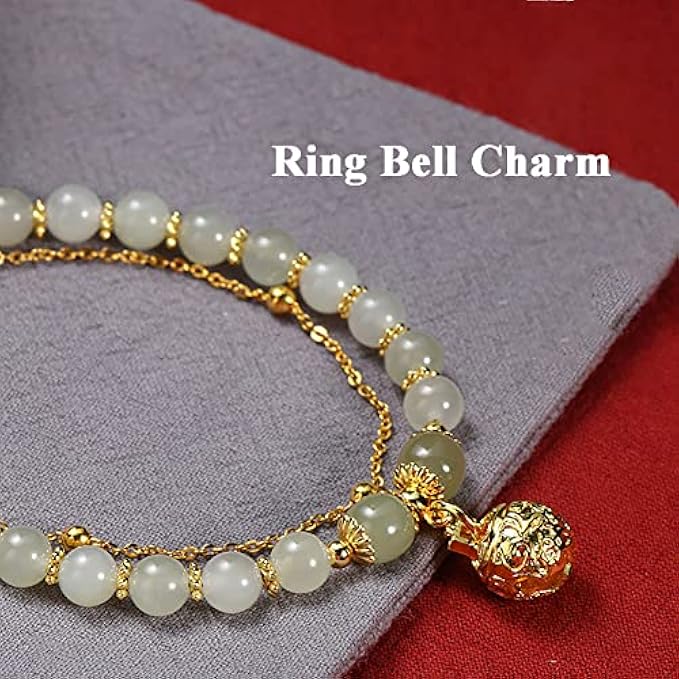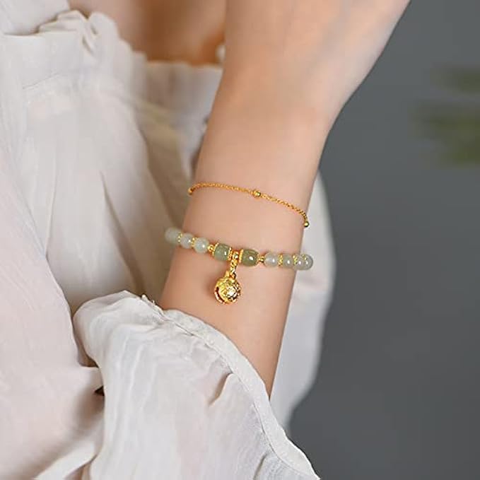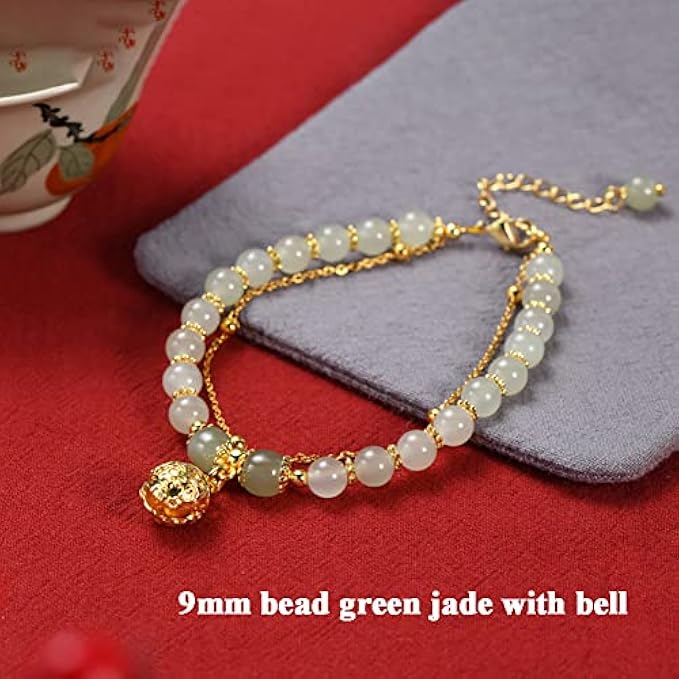 FitJinZun Green Natural Hetian Jade Bracelet for Women, Bead Charm Ring Bell Adjustable Bangle Alloy Lucky 2 Layer Stackable Chain Jewelry Birthday Gift for Her