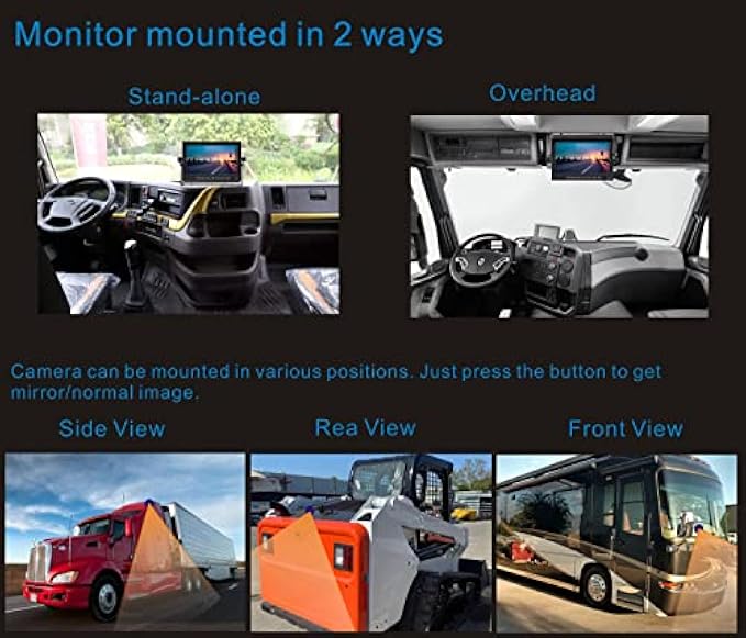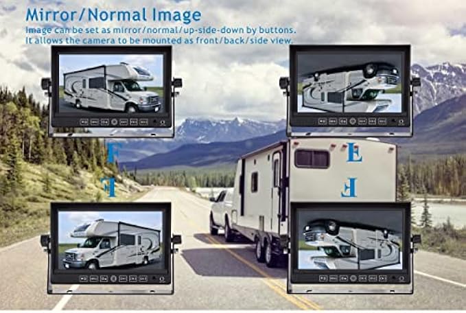 • 【Set Normal/Mirror Image】The image can be set as normal or mirror image by buttons, so the camera can be used as not only rear view but also front view. As the image can be set as various modes: mirror image, normal image, up-side-down image etc. so the camera can be mounted in any position of your vehicle, just press the buttons to set a right image.