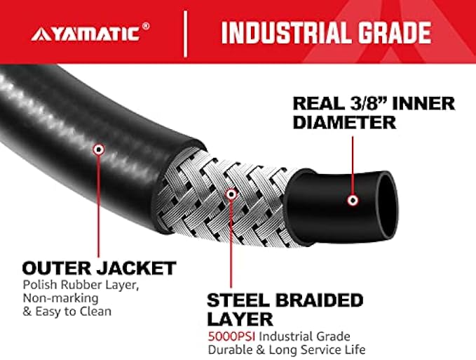 • [High Quality Rubber Jacket] The heavy duty outer layer of the 3/8" pressure washer hose is made of upgraded rubber material, polished surface, is wear-resistant, durable, easier and faster to remove the heavy dirty on the hose after washing work.