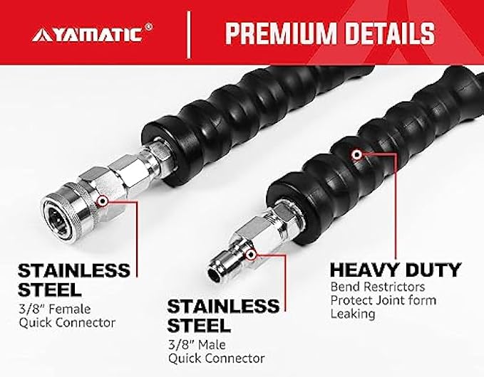 YAMATIC 3/8" Pressure Washer Hose 100FT with Stainless Steel Quick Connector, 5000PSI Rubber Power Washer Replacement Hose, Steel Wire Braided, Compatible with Simpson, Craftsman, Champion