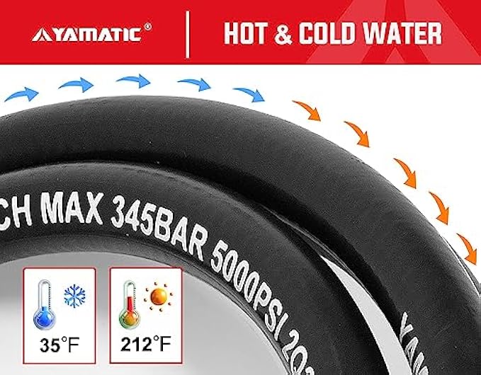 • [Hot & Cold Water] Rubber pressure washer hose compatible with both hot & cold water use with working temperature 35℉-212℉, great for commercial and household cleaning needs, to wash cars, motorcycles, machinery, floors, driveways, roofs, factories, swimming pools, siding during all seasons.