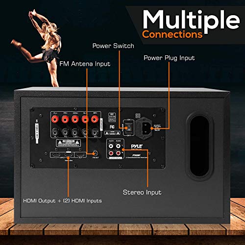 About this item 300 WATT POWER: The Pyle 5.1 Channel A/V Amplifier Receiver w/ Subwoofer is perfect for your audio and visual home theater entertainment system. It gives you 300W peak to be used for multi speakers allowing you to enjoy high quality amplified audio 5 INPUTS: The personal digital amp box features 2 HDMI IN / 1 OUT, 2 AUX stereo input, FM radio antenna input. Connect external sources such as Playstation, TV, Blu Ray, Xbox 360, laptop, computer, media server, CD or DVD player, and tape deck BLUETOOTH CONNECTIVITY: The professional integrated indoor house AV receiver is equipped w/ Bluetooth music streaming. Works w/ today’s latest devices including smart phones, tablets, iPhone and computer w/ hassle-free receiver pairing 5.1 SURROUND SOUND SYSTEM: The entertainment system provides full range audio reproduction. The Pyle entertainment set proudly brings you (1) base receiver w/ built in subwoofer, (1) center channel speaker, and (4) directable satellite speakers DIGITAL LCD DISPLAY: The compact amplifier has a built-in digital LCD display panel which displays all the functions and input used. A power cable and remote control are also included in the package for distant audio adjustments