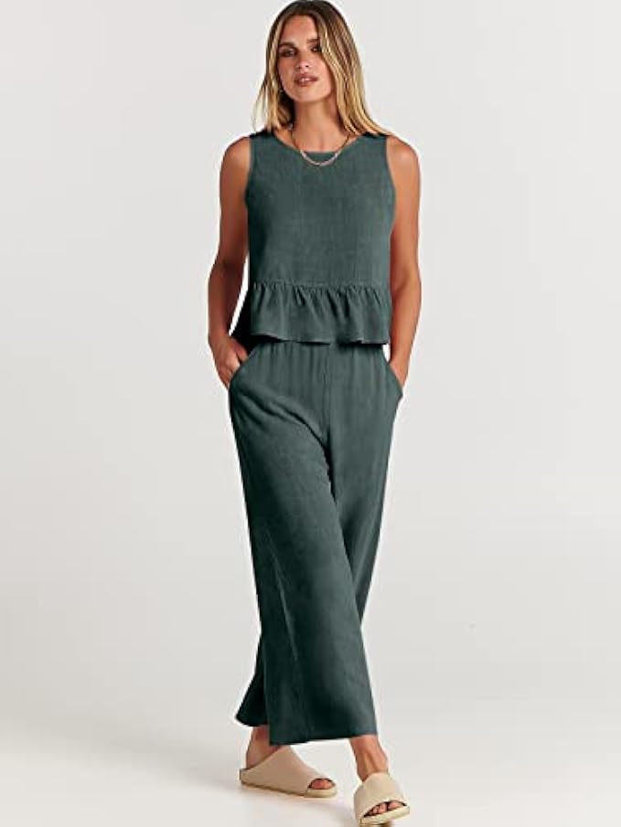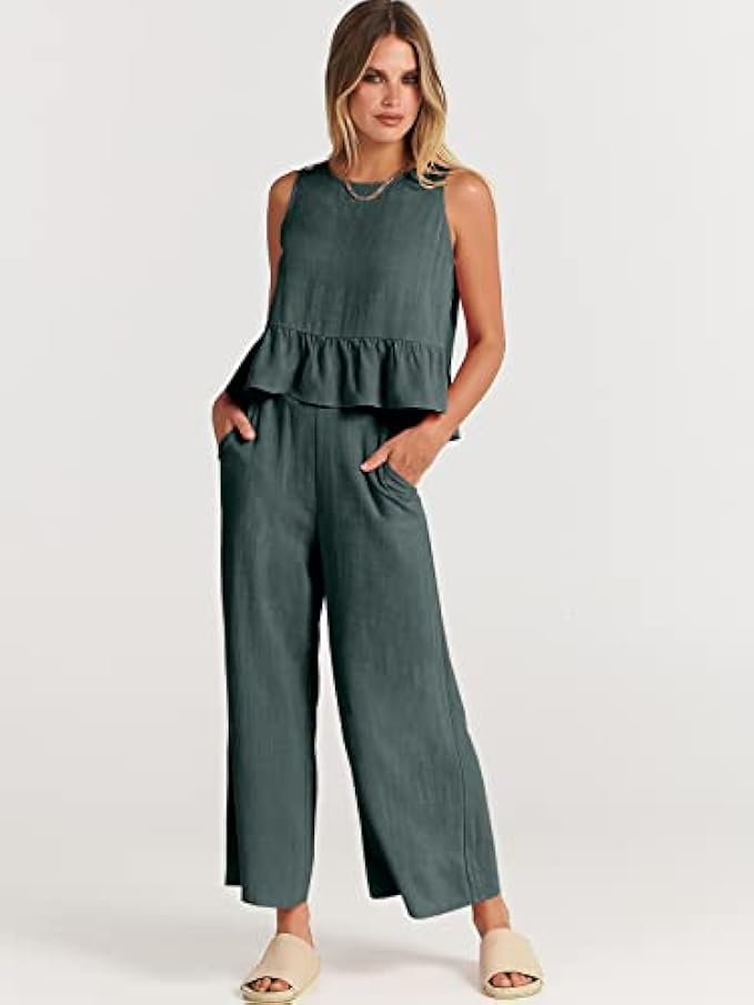 <li class="a-spacing-mini"><span class="a-list-item"> 30% linen + 70% rayon </span></li> <li class="a-spacing-mini"><span class="a-list-item"> Imported </span></li> <li class="a-spacing-mini"><span class="a-list-item"> Pull On closure </span></li> <li class="a-spacing-mini"><span class="a-list-item"> Dry Clean Only </span></li> <li class="a-spacing-mini"><span class="a-list-item"> Size - S=US(2-4), M=US(6-8), L=US(10-12), XL=US(14-16),XXL=US(18-20) </span></li> <li class="a-spacing-mini"><span class="a-list-item"> Chic and stylish - Look stylish and trendy in our cute summer outfits featuring a round neck crop top and high waist wide leg pants with a cool ruffle hem. </span></li> <li class="a-spacing-mini"><span class="a-list-item"> Versatile - Whether you're heading to a summer party, weekend getaway, or casual occasion, our outfits are suitable for any event. </span></li><li class="a-spacing-mini"><span class="a-list-item">Comfortable - Made of high-quality fabric with an elastic waistband, our outfits are soft and cozy to wear all day long.</span></li> <li class="a-spacing-mini"><span class="a-list-item">Care instructions - To ensure your outfit stays in great shape, we recommend dry cleaning to avoid shrinkage.</span></li>