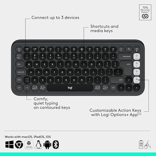 About this item Start With a POP: Stand out with this stylish Bluetooth keyboard and mouse combo that's bold in design, compact, and comes with customizable Action Keys and Buttons (1) so you can own your space Designed to be Different: This compact wireless keyboard and mouse combo is anything but ordinary; its modern, contoured design is made with recycled plastic (2) and is available in matching colors Make a Big Impression on the Quiet: The quiet keyboard has contoured, low-profile keys for comfortable typing, while the silent mouse features Silent Touch Technology to keep things extra quiet Life Is Easier With Shortcuts: Quickly switch between work, social, and break (Netflix, Spotify) modes, or access your AI tools with Action Keys, Action Buttons, and the Logi Options+ App (1) Easily Hop Across 3 Devices: Connect with Bluetooth to up to 3 wireless devices across OS (Windows, macOS, iPadOS, iOS [3], ChromeOS) and switch between them with a press of the Easy-Switch button Get Where You Need to Go Fast With POP Mouse’s Smartwheel: Shift from high-precision tracking to speed scrolling with one flick, helping you whizz through documents and web pages Go for Longer: The wireless mouse has a 2-year battery life, while the keyboard has a 3-year battery life (4); both feature power-saving auto-sleep modes to give you hours of use; batteries included Made With Recycled Plastic: Plastic parts in the POP ICON Combo include between 37% and 70% recycled plastic depending on the color; uses FSC-certified paper for responsible packaging