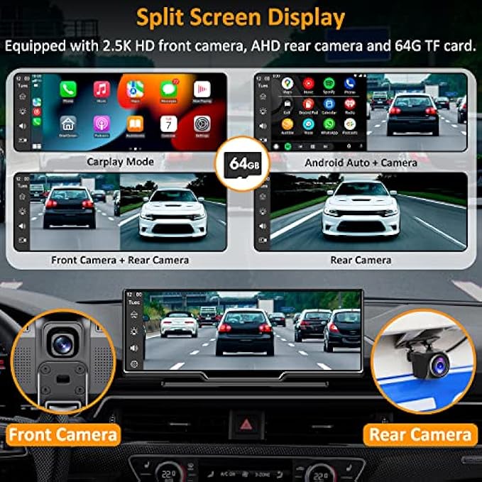 • ?Safe Driving & DVR Loop Recording: Equipped with 2.5K HD front camera and AHD rear camera. This touchscreen dash cam supports split screen. When you are reversing, the front view and rear view images can be displayed on the screen at the same time, which is more safe and effective. The package contains a 64G TF card, after inserting the card, the system will automatically enter the recording mode.