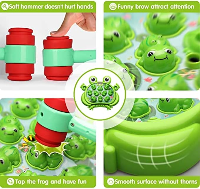 • ✔️【Upgraded Design-Spray Function】The upgraded Frog Game Toy now features a spray function that further stimulates kids interest. It automatically sprays upon turning on the toy or passing a level. Kids can select different modes by pressing the switch button, causing the frog to change and glow with a soft, non-dazzling light. This helps to improve their visual, language, and musical sound recognition abilities. When the frog isn't hit, the toy continues to encourage the child to keep playing.