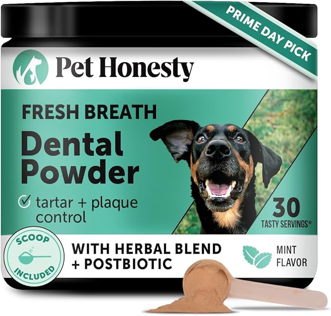 Easy Dog Teeth Cleaning & Breath Freshener: Simplify dental care with Pet Honesty's dog dental powder. This blend of natural ingredients fights bad breath and supports healthy teeth and gums. No need to rely solely on brushing—just add this tasty powder to your pup’s food for effortless dental support.