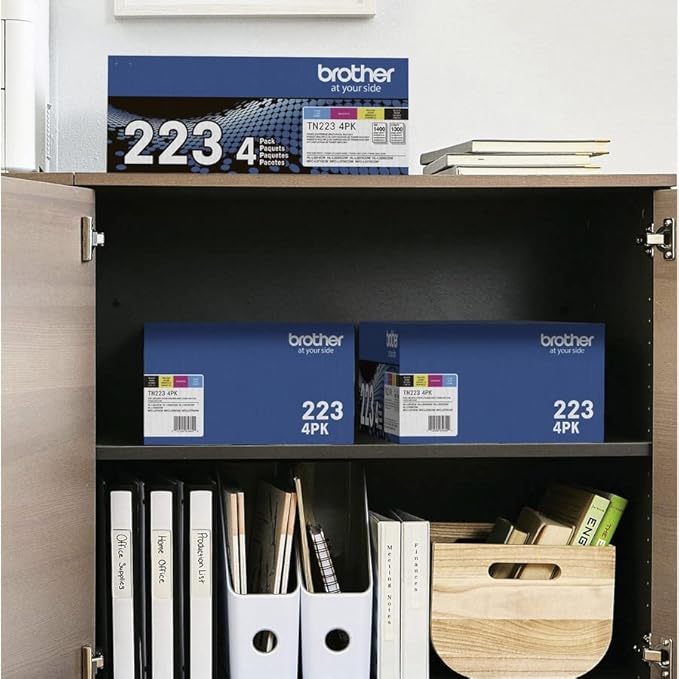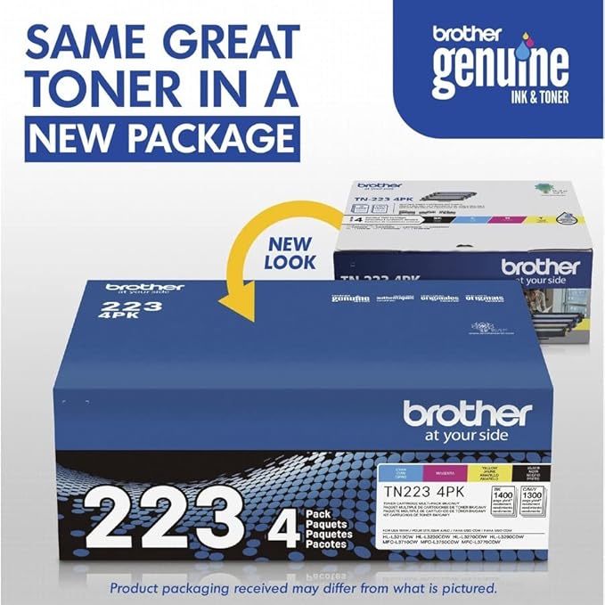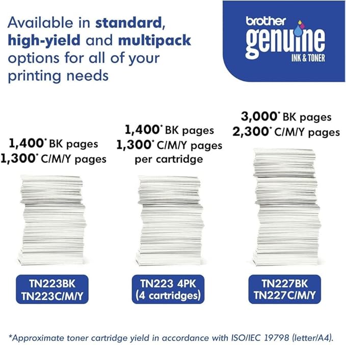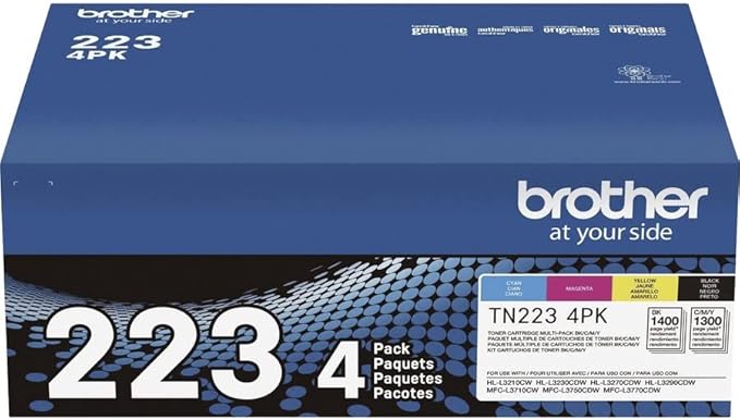 • BROTHER GENUINE STANDARD-YIELD TONER CARTRIDGE FOUR PACK TN223 4PK: Contains one cartridge each of Black, Cyan, Magenta and Yellow toner that provides professional laser print quality for up to 1, 400 pages per black cartridge(1) and up to 1, 300 pages per color cartridge. (1)