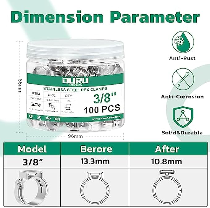 • OURU Pex Clamps: These pinch clamps include 100pcs 3/8 inch(10.8-13.3mm) pex ear clamps, which are stored in a bottle for easy storage and portability. These pex fitting clamps are designed for use with pex tubing and can be easily installed and disassembly for daily applications