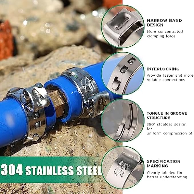 • Upgraded Thicker: Don't worry about crimp breakage caused by thin material. Special narrow band design that provides a more concentrated sealing pressure and allows for quick connection of all PEX pipe fittings. Our pex crimp hose clamps also have a high-precision size design,which ensures that you can choose the right size for perfect fastening and a leak-free seal